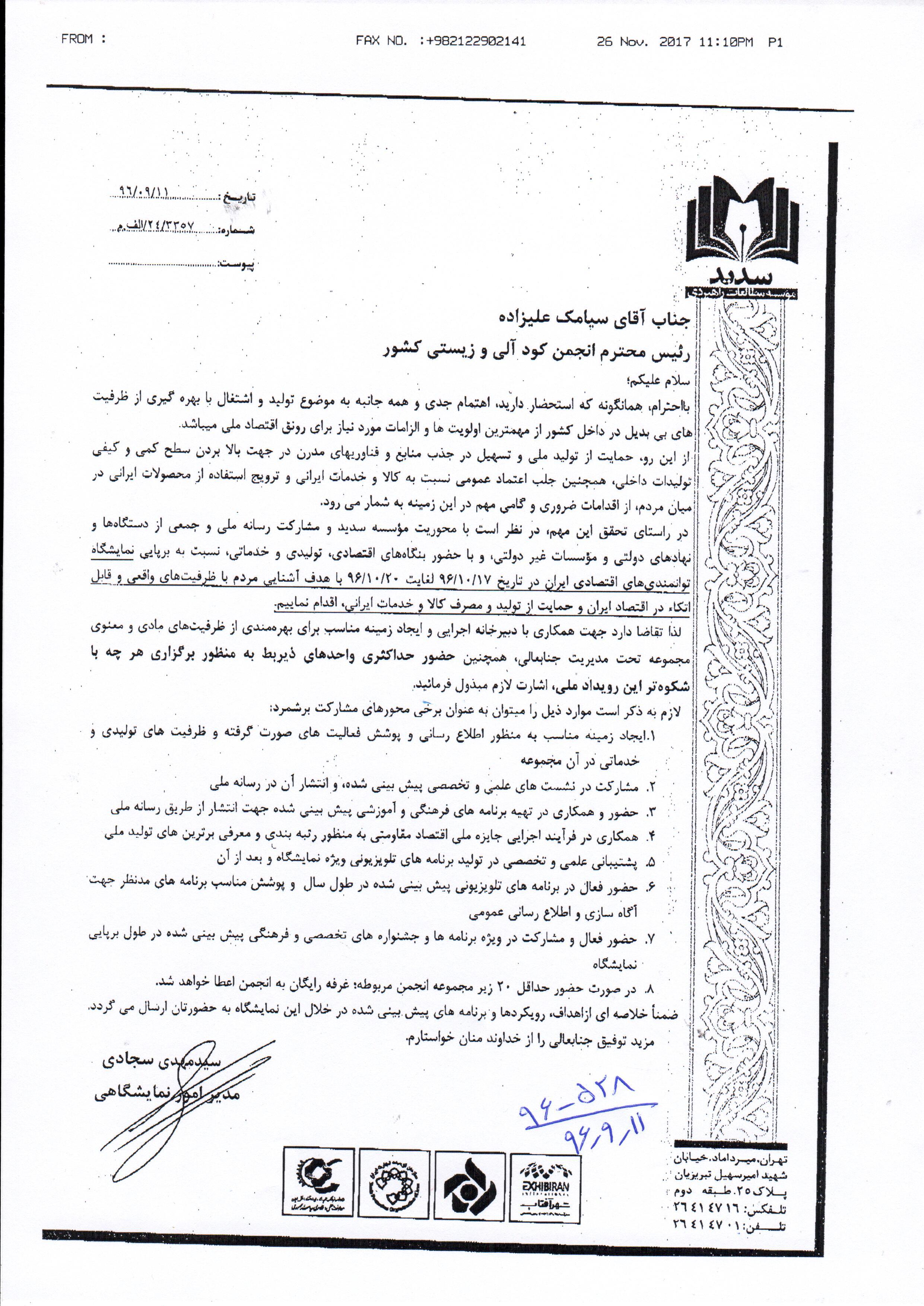 از اعضای محترم انجمن درخواست شرکت در این نمایشگاه را داریم جهت هماهنگی بیشتر با دفتر انجمن و یا شرکت سدید26414701 تماس حاصل نمایند