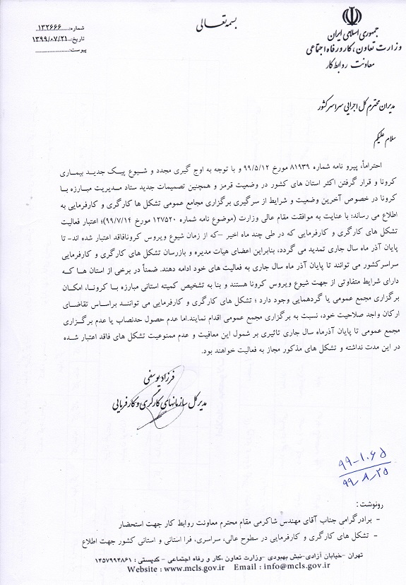 آذرماه سالجاری اعضای هیات مدیره و بازرسان تشکل های کارگری و کارفرمائی بفعالیت خود ادامه دهندو تشکل های مذکور مجاز بفعالیت خواهند بود.