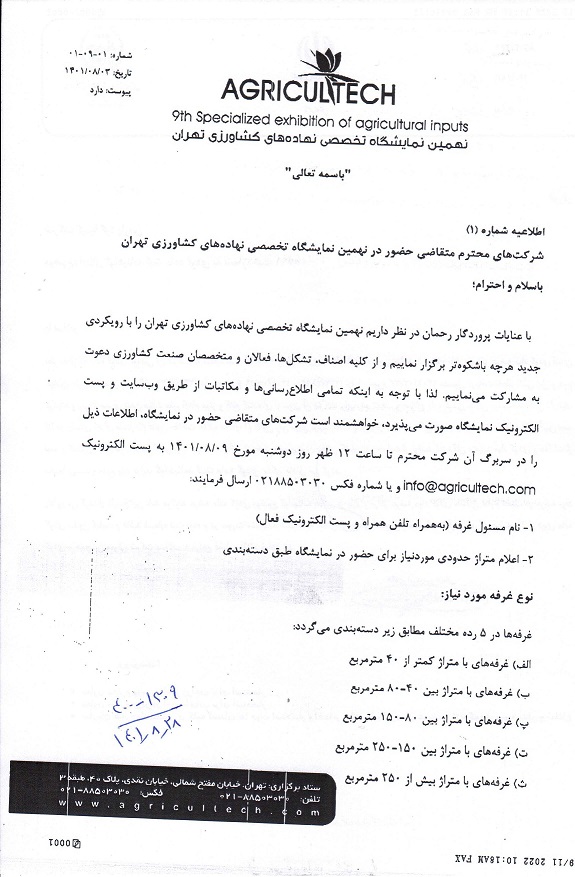 1402/10/1اطلاعیه دهمین نمایشگاه نهاده های کشاورزی تهران