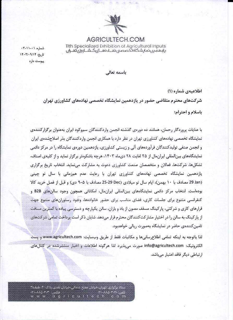 1402/10/1اطلاعیه دهمین نمایشگاه نهاده های کشاورزی تهران